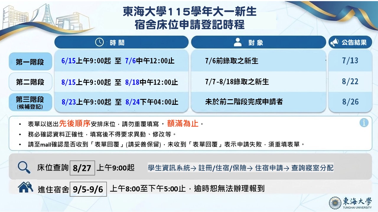 1.115學年新生床 位登記自本(115)年6月15日上午9時開始,本(115)年8月 27日上午9時後,方可查詢寢室分配狀況。