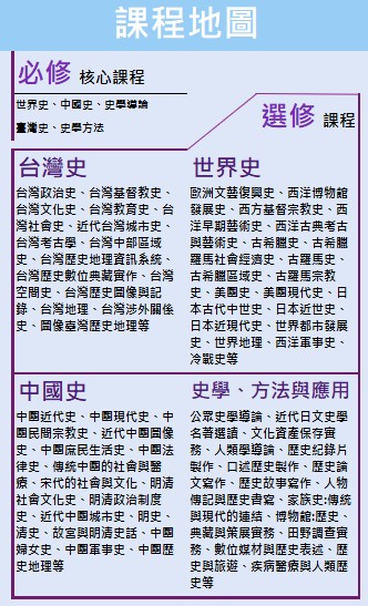 因應本系培育史學研究與教學人才的需求,培養其基礎歷史知識的能力,是以課程規劃與設計為臺灣史6學分、中國史8學分、世界史8學分、史學導論與史學方法8學分,共計30學分,佔其畢業學分128的約四分之一,使其具備四個領域的基本知識,奠定學生瞭解其間歷史淵源與發展脈絡的基礎。